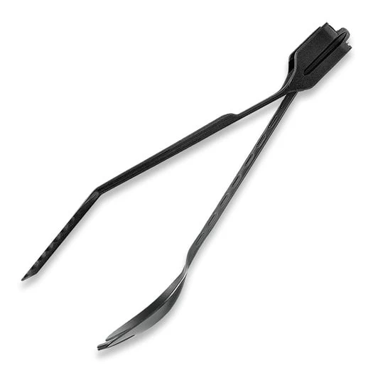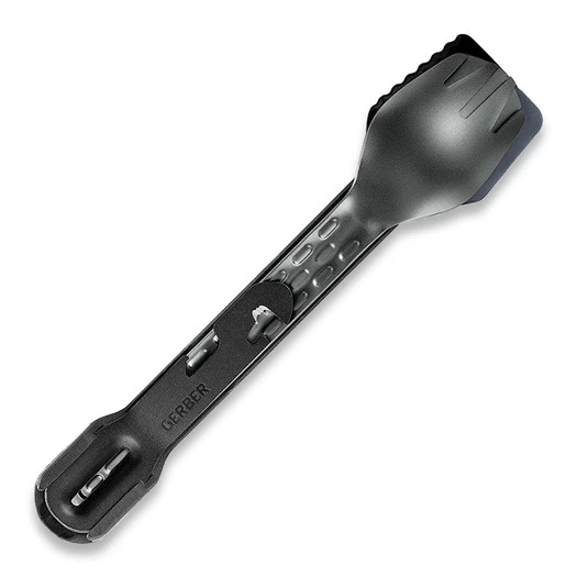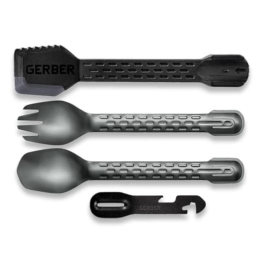 197 mm overall. Aluminum fork, aluminum spoon, nylon spatula with silicone overmold, and four function multi-tool. Tools include: Bottle opener, veggie peeler, serrated package opener, and can opener. Deep basin spoon. Tongs (fork or spoon plus spatula). Color: Onyx.