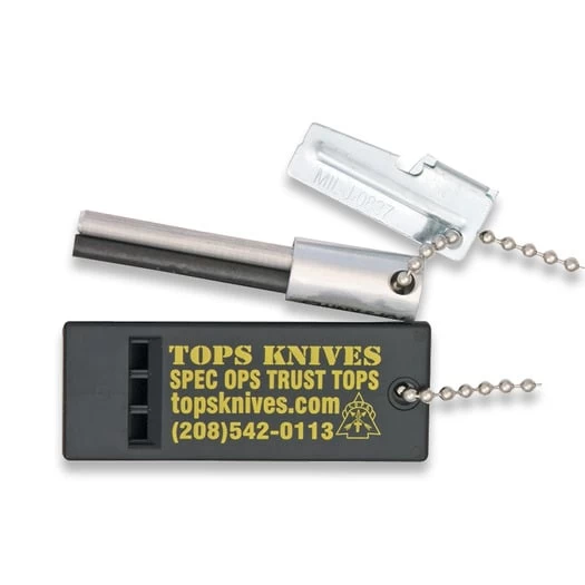 Features three rods (1 Ferrocium-Super Flint Starter and 2-Magnesium Hot Rods) all pressed into aircraft aluminum barrel. Also includes P-38 can opener and a TOPS survival whistle with neck chain.